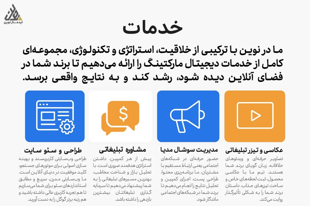 ما در نوین با ترکیبی از خلاقیت، استراتژی و تکنولوژی، مجموعهای کامل از خدمات دیجیتال مارکتینگ را ارائه میدهیم تا برند شما در فضای آنلاین دیده شود، رشد کند و به نتایج واقعی برسد.